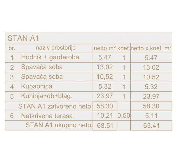 Na prodaju je stan oznake A1 u prizemlju zgrade neto korisne površine 63,41 m2.