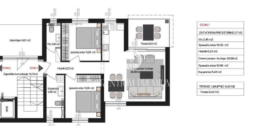 Ukupna površina stana iznosi 66,48 m², uz dodatnu ostavu u podrumu površine 5,5 m². Stan se sastoji od ulaznog hodnika, kupaonice, gostinjskog WC-a, dvije spavaće sobe te prostranog dnevnog boravka s kuhinjom i blagovaonicom, s izlazom na terasu površine 8,42 m².