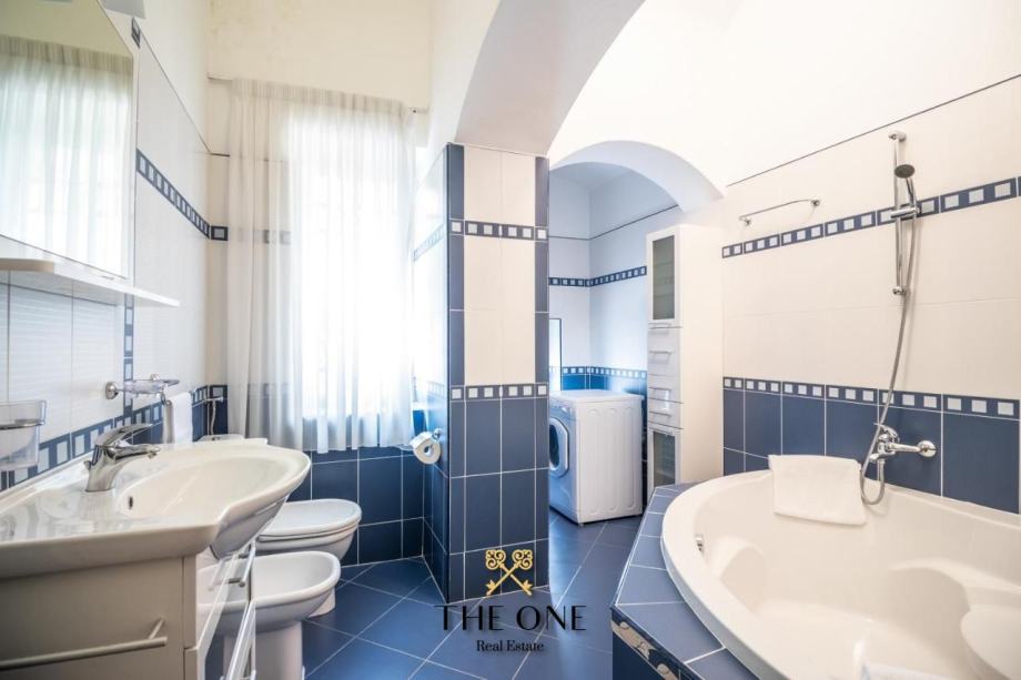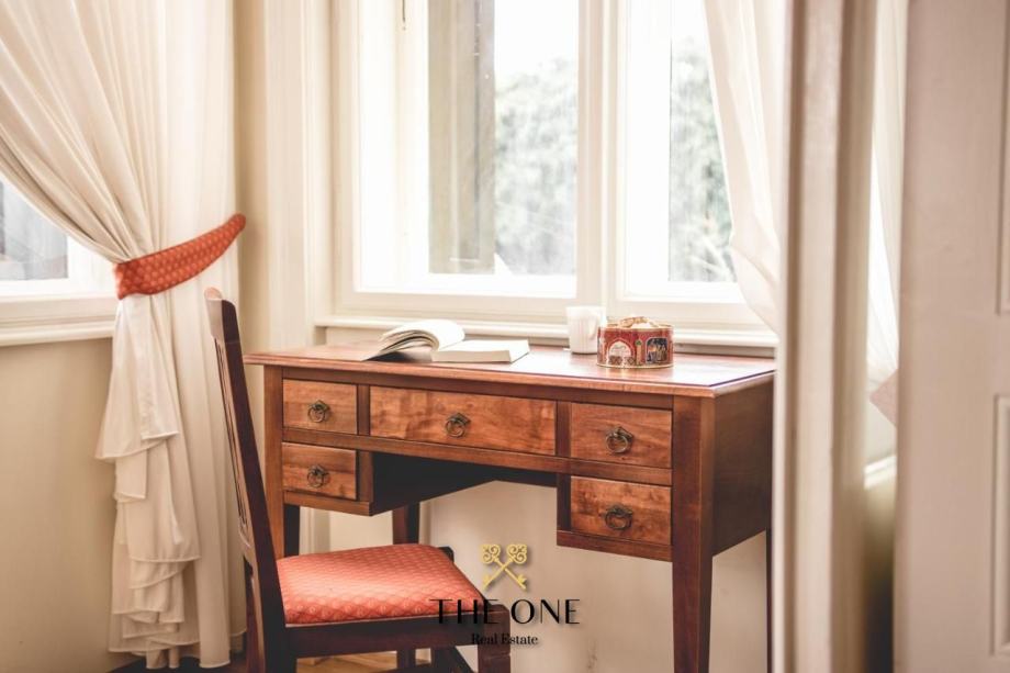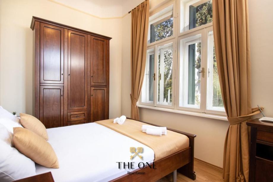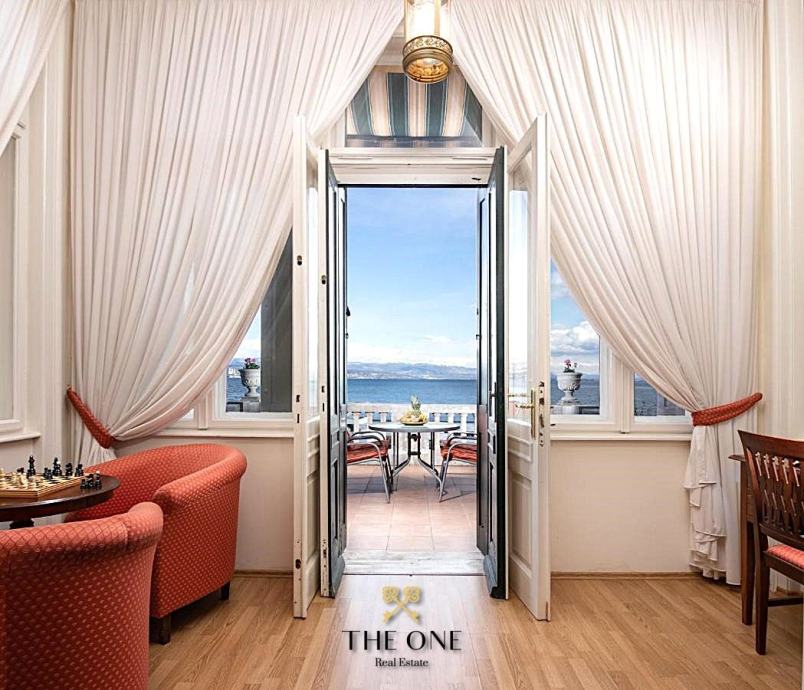 Nedaleko centra Opatije, a prvi red uz more nalazi se secesijska vila s kultiviranom okućnicom i direktnim izlazom na Lungomare šetalište. U visokom prizemlju vile nalazi se predivan četverosobni stan s prostranom terasom. S terase se pruža predivan panoramski pogled na more.