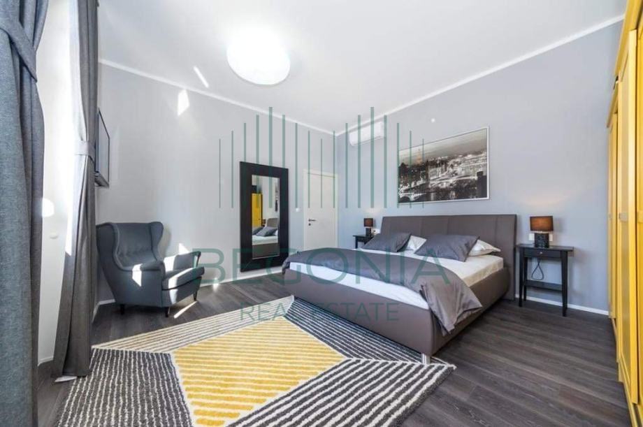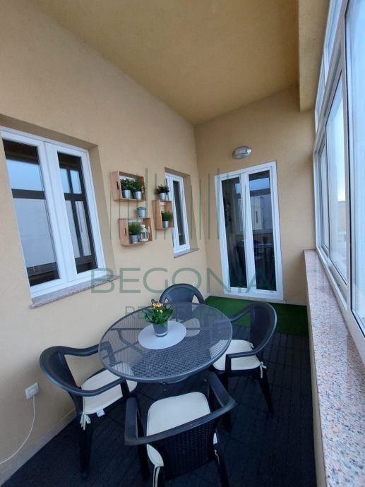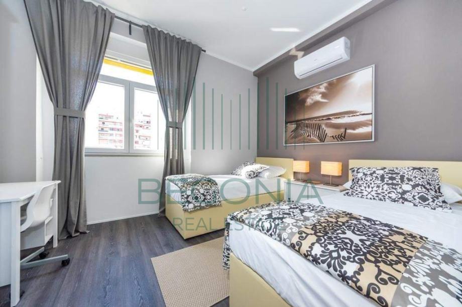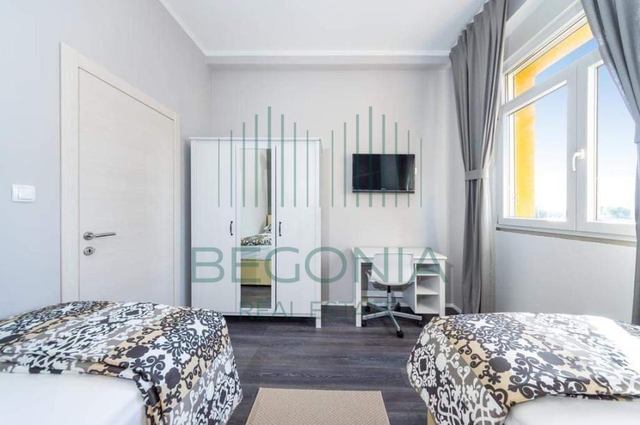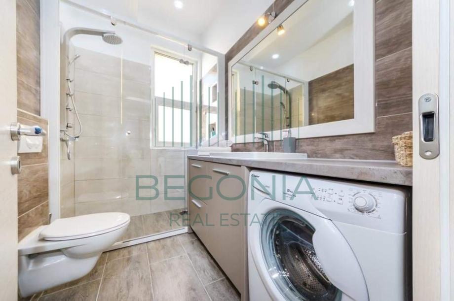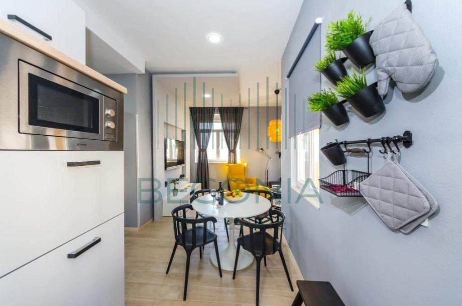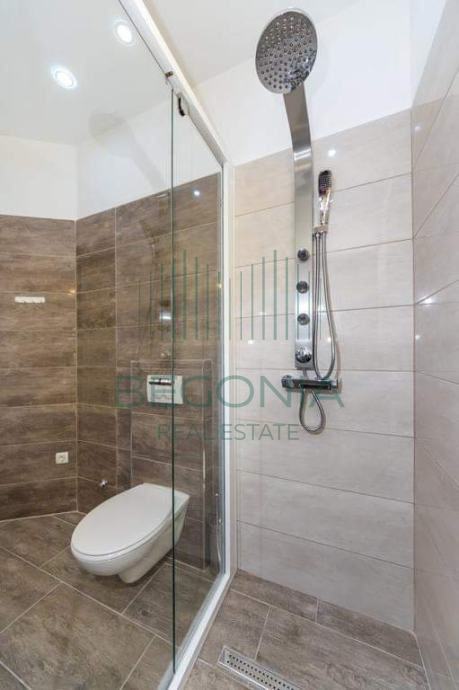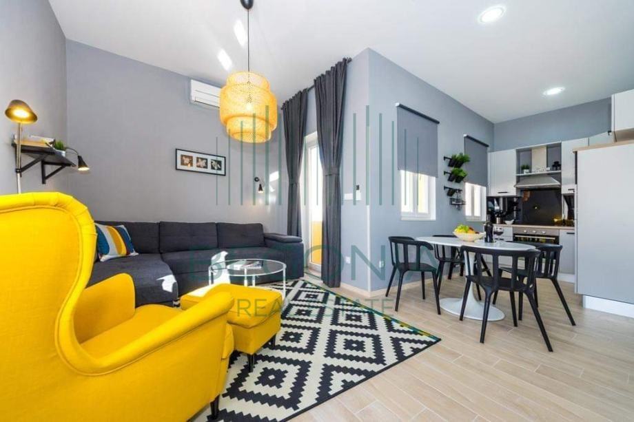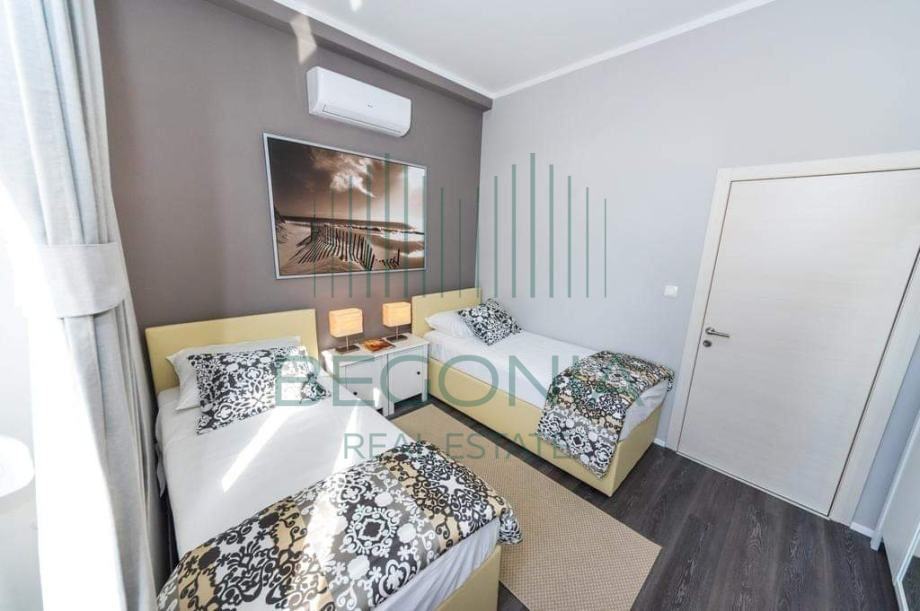 Stan na odličnoj lokaciji prvi red do mora vrhunski sređen na 4 katu u zgradi sa ukupno sedam stambenih jedinica i poslovnim prostorom u prizemlju u kojem se nalazi banka . Zgrada koja se redovito održava i uređuje ima lift i zajedničku krovnu terasu sa kaminom i prekrasnim pogledom na more i stari grad. Stan se sastoji od dvije spavaće sobe od kojih jedna ima 20 m2, kuhinja sa blagovaonom,dnevni boravak,wc sa kupatilom i lođa-terasa koja je ostakljena alu kliznim stijenama. Unutarnje jedinice sustava hlađenje/grijanje se nalaze u svakoj spavaćoj sobi po jedna te jedna se nalazi u dnevnoj odnosno grije/hladi ostatak stana. Stan je renoviran 2016 godine i od tada je korišten u turističke svrhe te mu je stanje i dalje kao novo. Stanu pripada drvarnica u prizemlju veličine 3-4 m2 koja se nalazi u dvorištu koje zgrada koristi za parking.