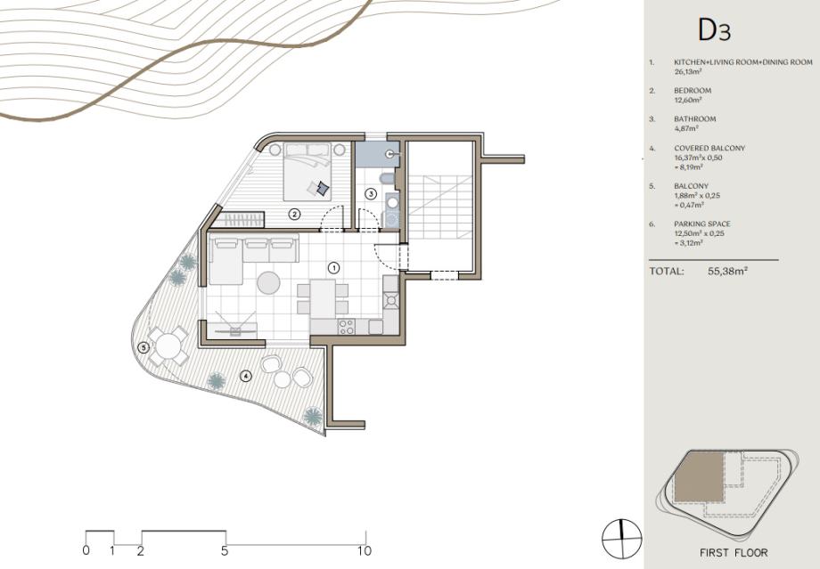 Ovaj šarmantan stan (D3), veličine 55,38 m2, smješten je na prvom katu četvrte zgrade koja ima ukupno pet stanova. Pažljivim projektiranjem, osmišljen je maksimalno iskorišten prostor koji svojim novim vlasnicima nudi sve potrebno za provođenje najljepših ljetnih trenutaka. Open space koncept objedinjene kuhinje s blagovaonicom i dnevnim boravkom površine 26,13 m2 daje dodatnu prostornost cijelom stanu. Južna orijentacija i velika staklena stijena osiguravaju mnogo prirodnog svijetla, što cijeli prostor čini prozračnim i ugodnim za boravljenje. Balkon ima površinu 17,41 m2 te se na istI izlazi iz dnevnog boravka. Stan se sastoji od spavaće sobe, kupaonice, a pripada mu i vanjsko parkirno mjesto. Predviđeni završetak je kraj 2026. godine.