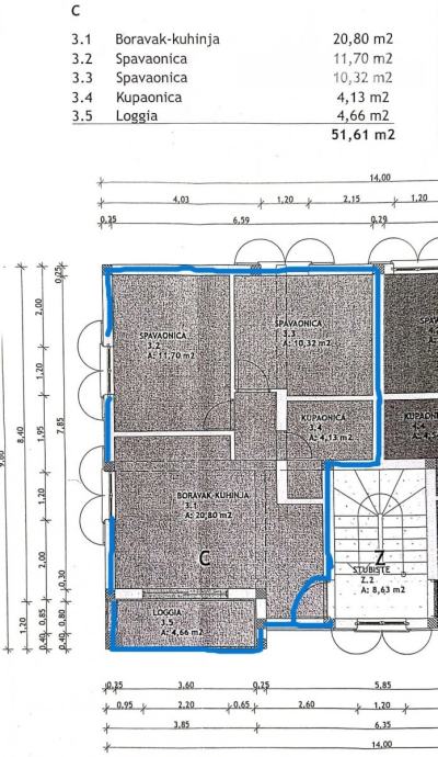 Stan je veličine 51,61 m2, a sastoji se od ulaznog hodnika, kuhinje, blagovaonice, dnevnog boravka iz kojeg se izlazi na prekrasnu veliku terasu, dvije spavaće sobe i kupaone.