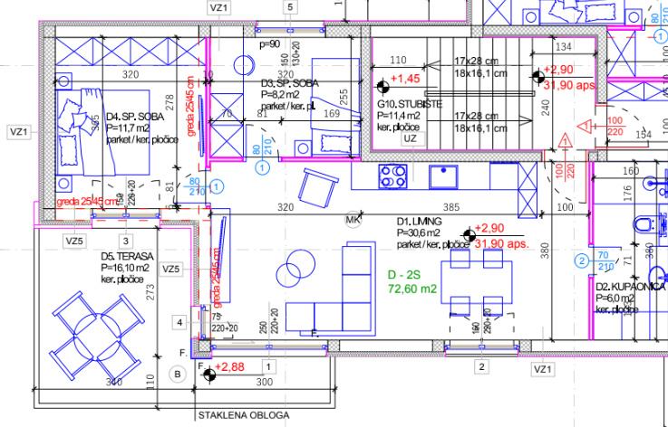 Stan se sastoji od dvije spavaće sobe, dnevnog boravka, kuhinje s blagovaonicom, kupaonice i hodnika ukupne površine 56.50 m2, a također mu pripada i terasa površine 16.60 m2. Stanu pripada i jedno spremište površine 7 m2 te dva parkirna mjesta.