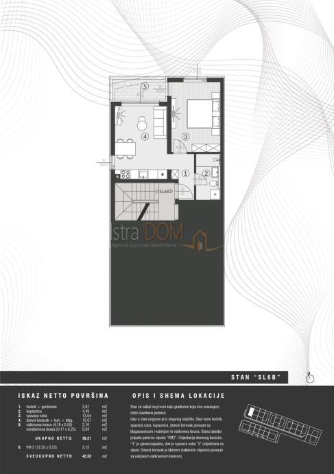 Stan se sastoji od hodnika, jedne spavaće sobe, kupatila, dnevnog boravka povezanog sa blagovaonicom i kuhinjom te natkrivene terase koja je sa staklenom stijenom povezana sa dnevnim boravkom.