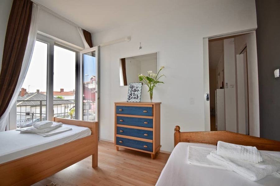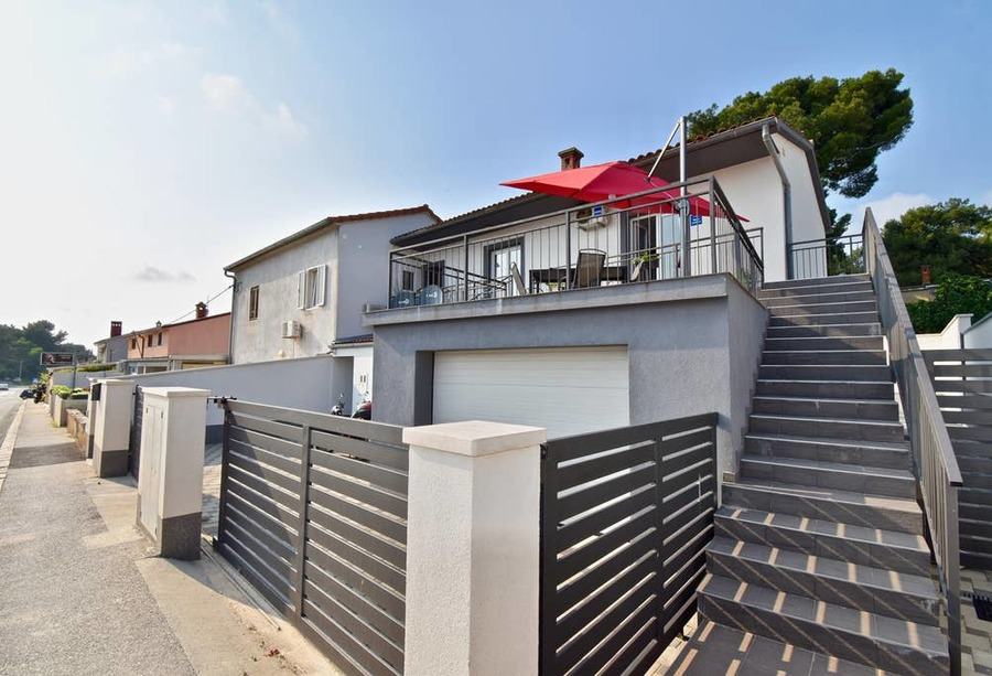 Stan se nalazi u neposrednoj blizini Pula City mall-a - 550m, Busoler Park suma odmah iza kuce, market preko puta kuce, autobusna stanica na 100m. Stan se sastoji od dnevnog boravka sa ugaonom na razvlacenje, blagovaonice, kuhinje, 2 spavace sobe, kupaonice i terase od 25 m2. Stan je u potpunosti opremljen, klimatiziran i ima javni besplatni parking.