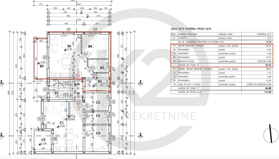 Predmetni stan oznake B nalazi se u prizemlju zgrade te se sastoji od ulaznog prostora, kupaonice sa WC-om, dnevnog boravka sa kuhinjom i blagovaonicom, dvije spavaće sobe i terase.
