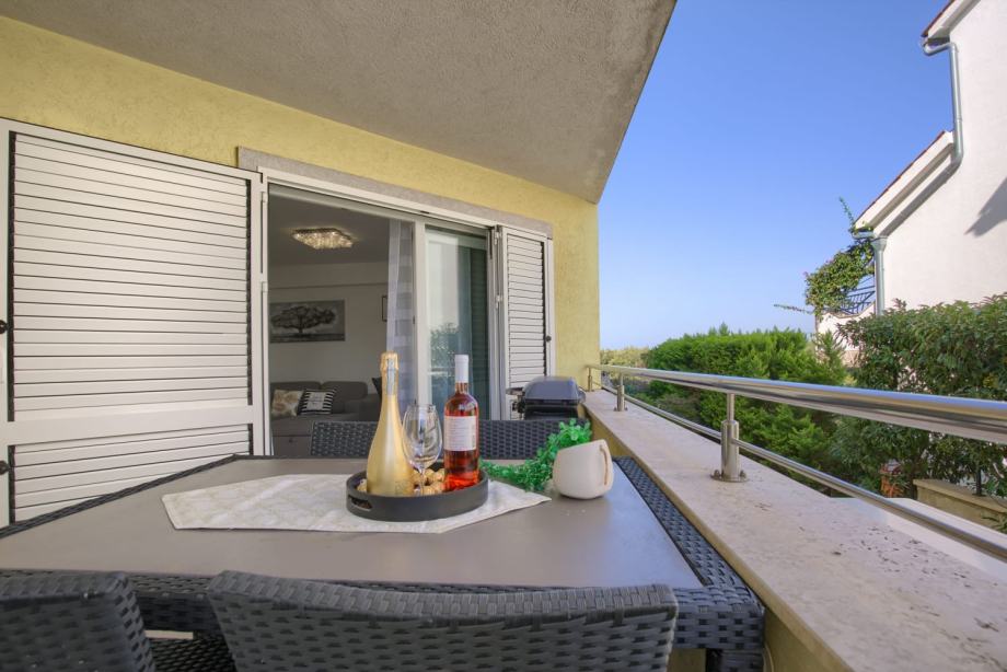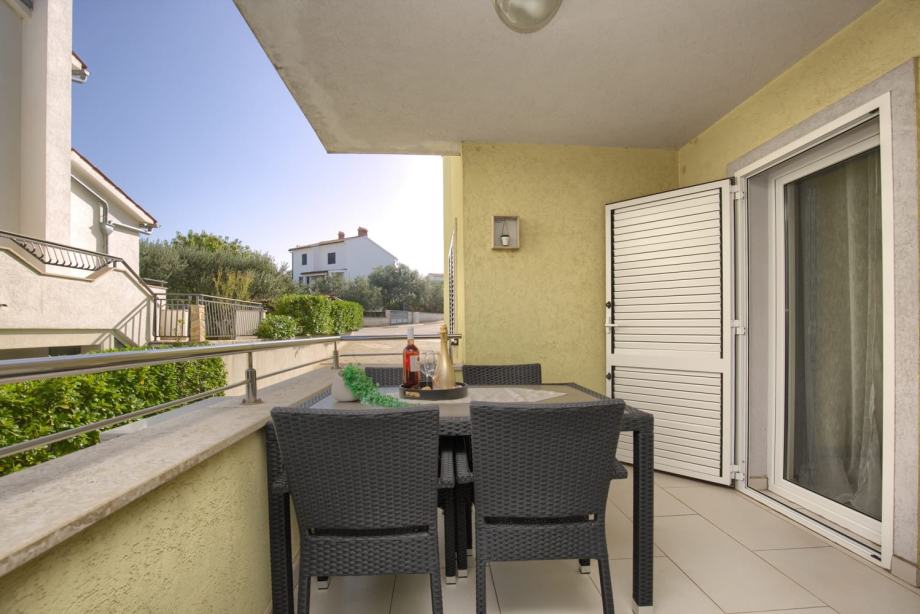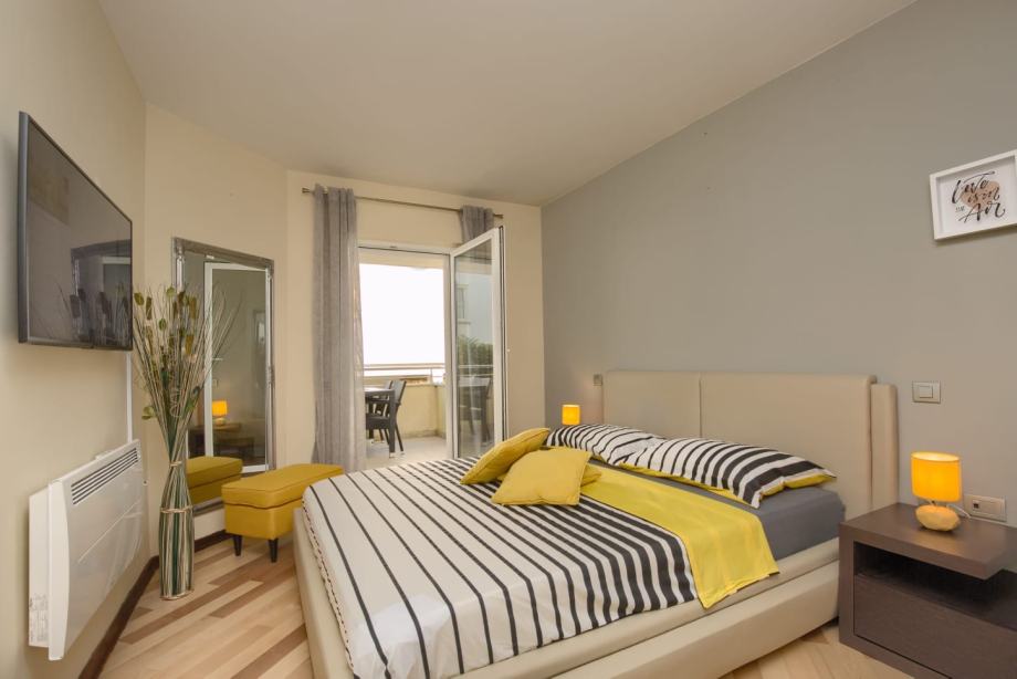 Stan se sastoji od spavaće sobe, kuhinje, dnevnog boravka sa blagovaonom, wc-a s kupaonom te terasom. Udaljenost od plaže je 600 m.