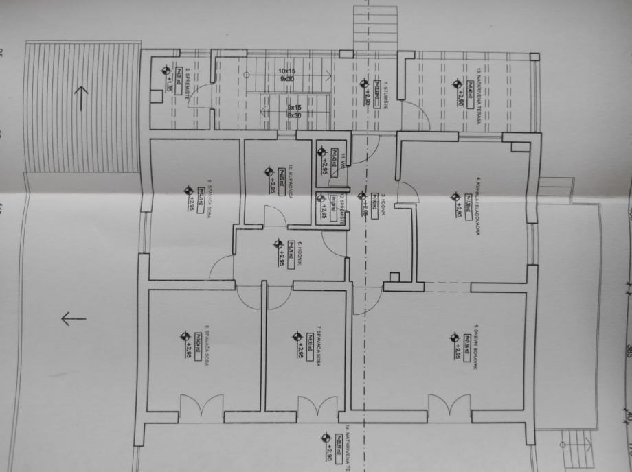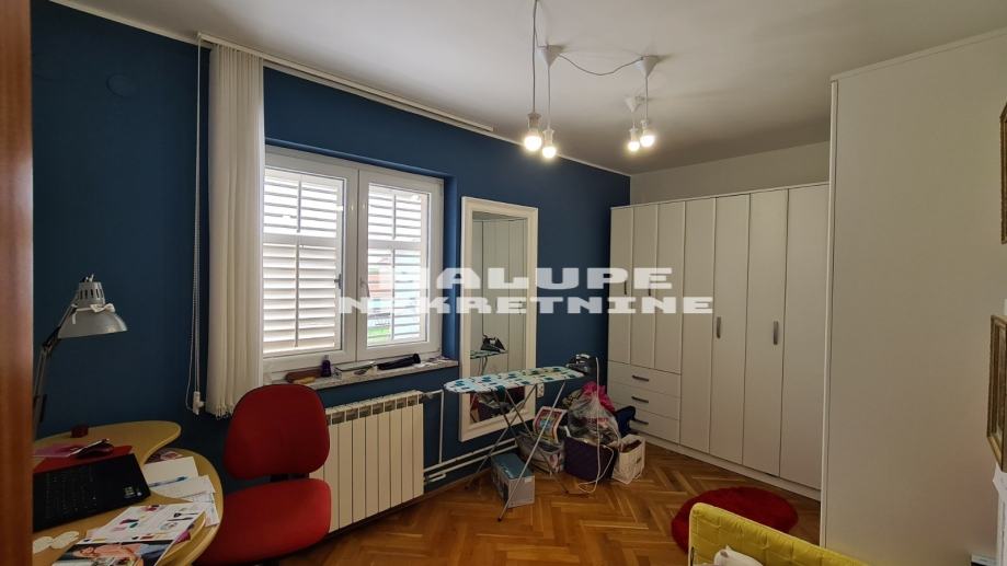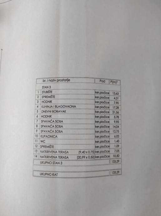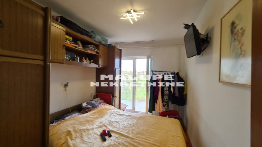 Stan se nalazi u kući na 1. katu i sastoji se od stubišta, 2 spremišta, 2 hodnika, kuhinje i blagovaonice, dnevnog boravka, 3 spavaće sobe, wc-a, i 2 natkrivene terase ukupne površine od 133m2.