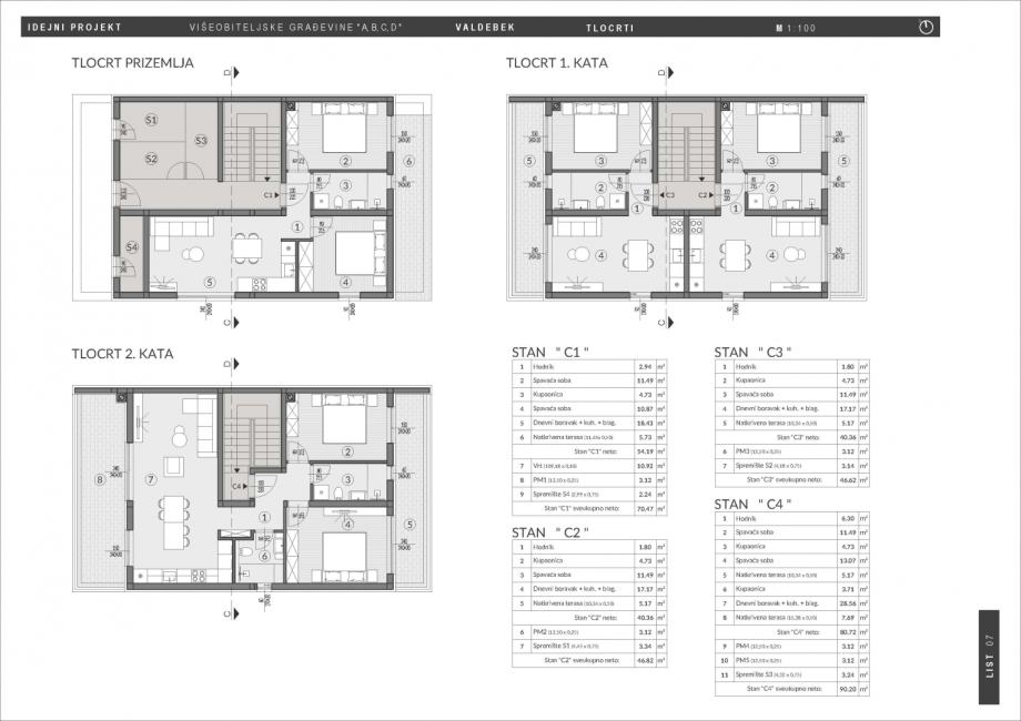Stan C1 nalazi se u prizemlju i sastoji se od hodnika, 2 spavaće sobe, kupaonice, dnevnog boravka i kuhinje, natkrivene terase, spremišta, parking mjesta, i vrta 109m2.
