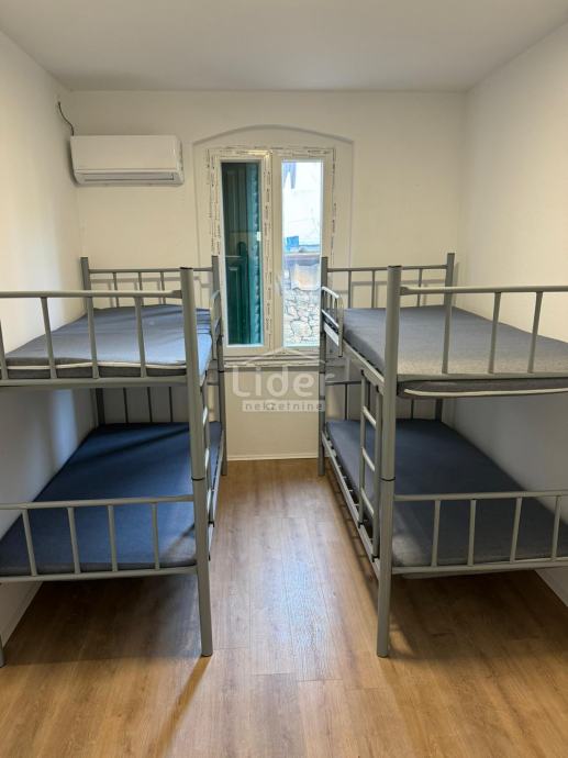 Iznajmljuje se stan za radnike ( max 14 osoba). Stan se sastoji od tri sobe kuhinje , blagovaone . Stan je u prizemlju ima pristup s dvije strane te dvorište u kojem je moguće parkirati motore ukoliko je potrebno za radnike dostavljače. Stan je novo uređen. Grijanje je na klimu.