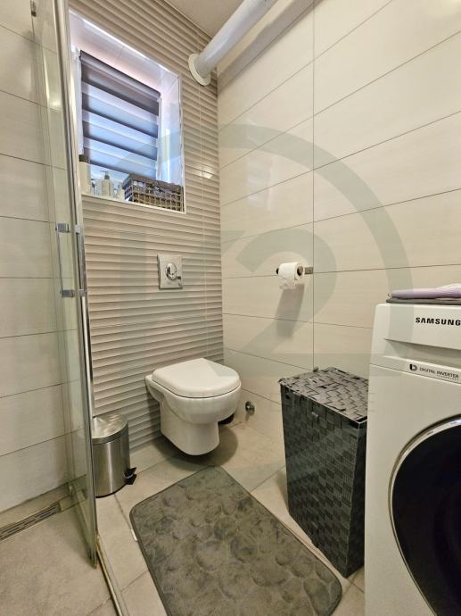Stran se sastoji od ulaznog hodnika, prostranog dnevnog boravka sa kuhinjom i blagovaonicom te izlazom na veliku natkrivenu terasu površine 36 m2 na kojoj se nalazi stol za 8 osoba te zidani kamin, veće spavaće sobe sa walk-in garderobom te izlaznom na balkon, manje spavaće sobe koja također ima izlaz na balkon i kupaonice sa WC-om.
