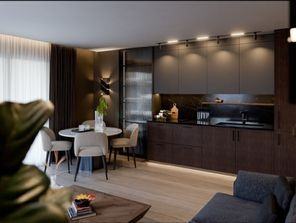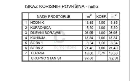 Stan od 92,58m² korisne površine na prvom katu zgrade. Stan se sastoji od hodnika (3,85m²), dnevnog boravka (26,95), kuhinje (13,24m²), kupaonice (5,30m²), veće spavaće sobe (21,40m²), manje spavaće sobe (8,34m²), i terase (18,00 sa koeficijentom 0,75-13,50m²) te mu pripadaju 2 vanjska parkirna mjesta svaki veličine 12,50m² ( sa koeficijentom 6,25m²) sveukupno 99m².