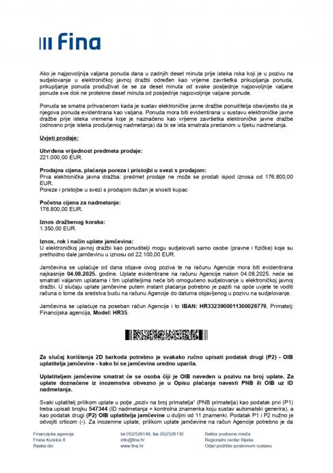 Predmet prodaje je nekretnina upisana u zk.ul.br. 3285, kč.br. 1061/5, k.o. Drenova. Prodaje se 4.