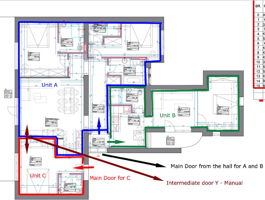 Veliki i mali stan imaju odvojene ulaze, ali se u njih ulazi iz manjeg hodnika nakon glavnih vrata sa stubista. Na druga glavna vrata sa stubista se ulazi u garsonjeru. Vec spomenuto, garsonjera i veliki stan imaju internu komunikaciju po zelji kroz klizne stijene, objasnjenu u gornjem opisu.