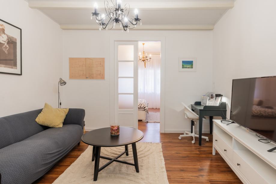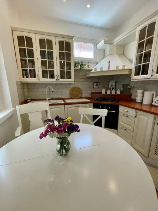 Dvije spavaće sobe, dnevni boravak, kuhinja, spremište, kupaonica, balkon.
