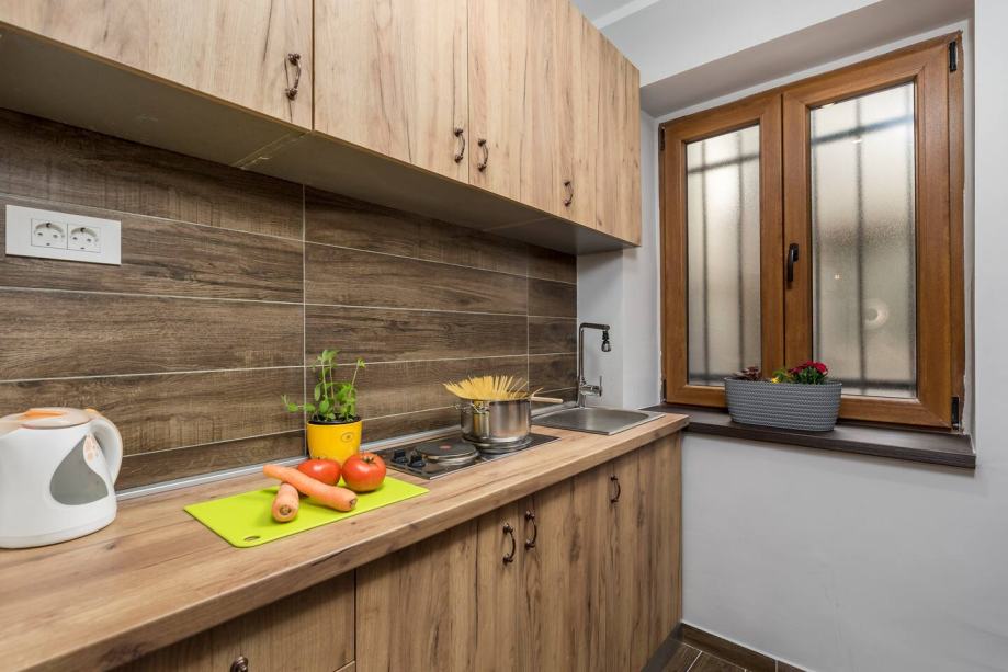 Stan 82m2 u naravi podijeljen na dva apartmana koji dijele zajednički ulazni hodnik, ugrađene pametne brave i video nadzor. Svaki apartman ima odvojenu spavaću sobu, Dnevni boravak sa kuhinjom i ležajem na razvlačenje tako da je maksimalan kapacitet u svakom apartmanu 4 osobe, apartmani imaju svaki po dvije televizije sa zemaljskom, satelitskom (na svim) i netflixom u dnevnom boravku. Veći apartman ima podno grijanje i perilicu za veš u kupaoni.