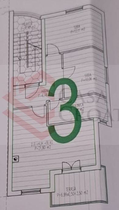 Prodaje se stan C na 1. katu zgrade s 4 stana ukupne korisne površine 76,88 m2 (netto 63,39 m2) koji se sastoji od: hodnika, dnevnog boravka s kuhinjom i blagovaonicom, kupaonice i dvije sobe korisne površine 57,39 m2 (netto 57,39 m2) sa pripatcima: terasom površine 6,99 m2 (netto 3,50 m2) i parkirnim mjestom P3 površine 12,50 m2 (netto 2,50 m2).