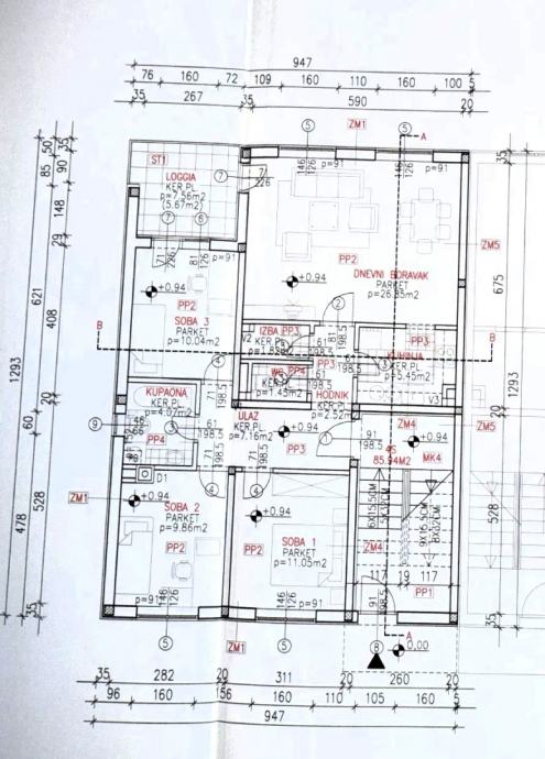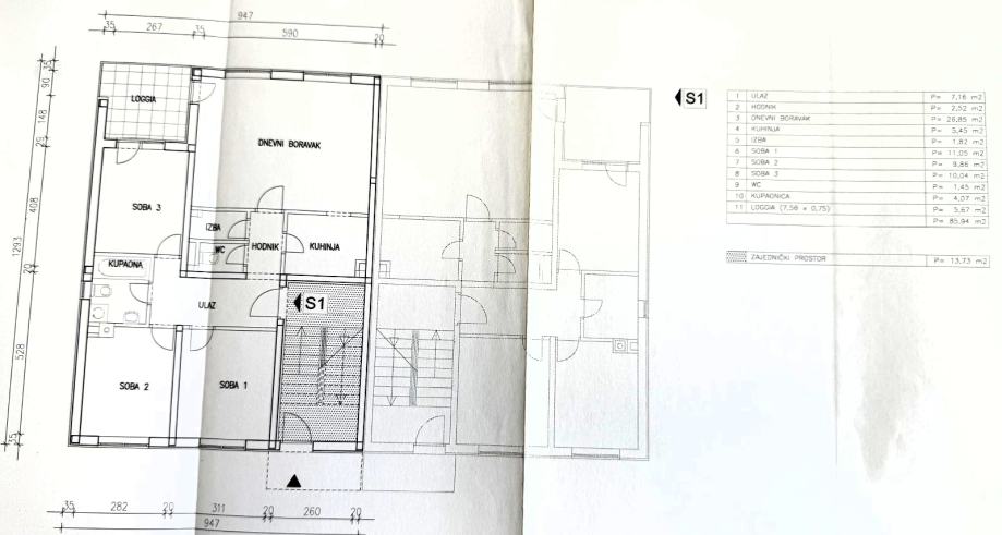 Četverosobni stan smješten je u prizemlju stambene zgrade i ima ukupnu površinu 85,94 m². Uz stan, uključena su četiri vanjska parkirna mjesta (P-3, P-4, P-5, P-6), koja imaju površine 2,88 m², pa zajedno s kvadraturom stana čine 97,64 m² korisnog prostora.