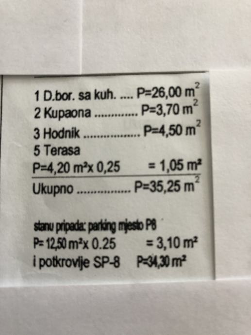 Gripole-Rovinj. Stan na 2. katu dvoetažni ukupne kvadrature 69 m2 sa vlastitim parkirnim mjestom 12,5 m2. Na prvoj etaži od 35 m2 nalazi se od hodnik, kupaona, balkon i kuhinje sa d.boravkom gdje se kružnim stepenicama ide u potkrovlje 34 m2 tlocrta pošto je nagib krova moguće je koristiti 50% gdje može biti jedna soba ili dvije(moguće pregraditi). Potkrovlje je uređeno i ima 3 krovna prozora. Stan je kao nov, polu namješten i koristi se vrlo rijetko. A certifikat sa odličnom izolacijom, vrhunskom stolarijom, pločicama i sanitarijama, te protuprovalnim vratima i video portafonom. Lokacija naselje Gripole. Stan je direktno od vlasnika te nema agencijske provizije.