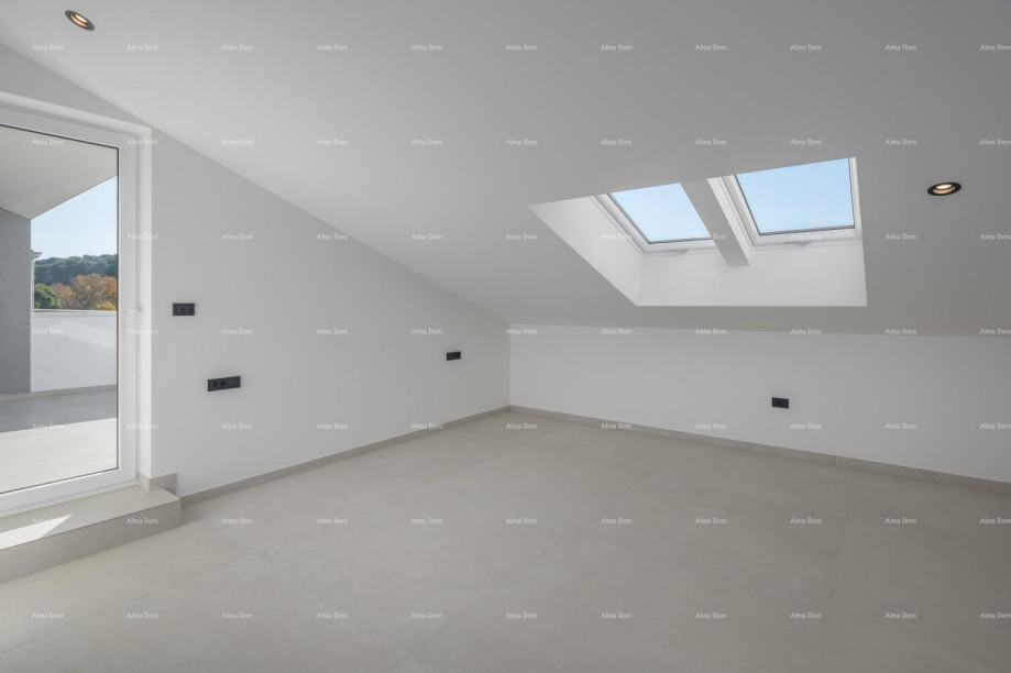 Unutarnje stepenice vode na drugu etažu gdje se nalaze još dvije spavaće sobe, kupatilo i velika krovna terasa sa koje pruža pogled na more i Rovinj.