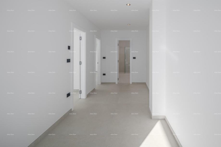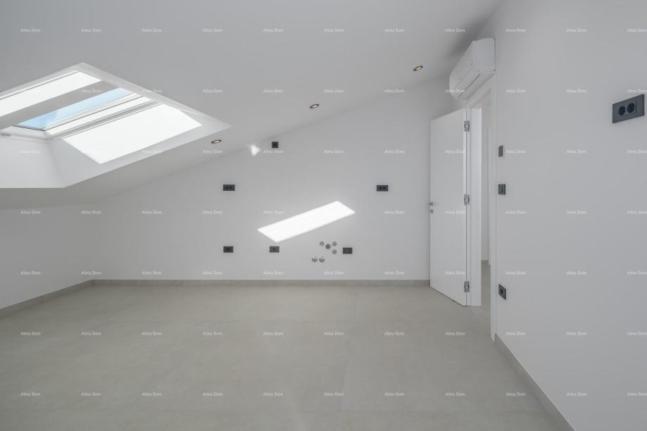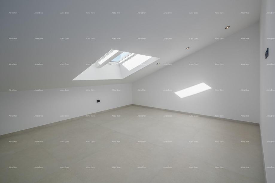 Unutarnje stepenice vode na drugu etažu gdje se nalaze još dvije spavaće sobe, kupatilo i velika krovna terasa sa koje pruža pogled na more i Rovinj.