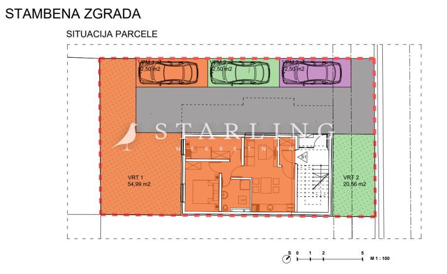 Prodaje se trosoban stan površine 52 m² u novogradnji smješten u prizemlju stambene zgrade s ukupno dva kata bez lifta.