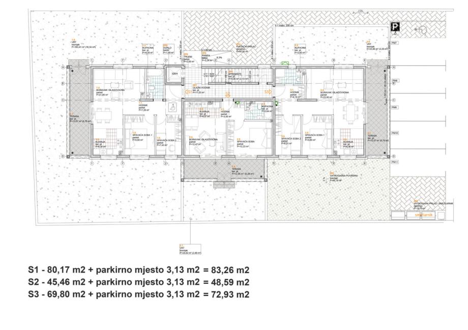 Svi stanovi imaju natkrivene terase, uz svaki stan se može kupiti jedno vanjsko parkirno mjesto.