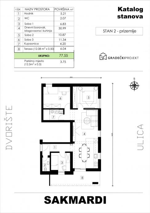 Četverosobni stan u prizemlju koji se sastoji od hodnika, dnevnog boravka s blagovaonicom, kuhinje, tri spavaće sobe, kupaonice i WC-a, ukupne neto korisne površine 77,55 m2, cijena 193.875,00 €