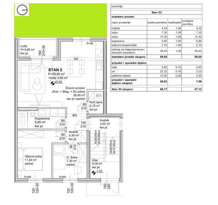 Stan S2 – prizemlje, obračunske površine 67,13 m²