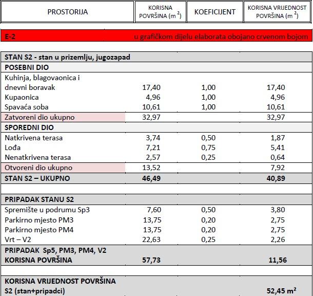 Stan oznake S2 nalazi se u prizemlju novogradnje s ukupno 8 stambenih jedinica. Ukupna netto površina stana iznosi 52,45 m2.