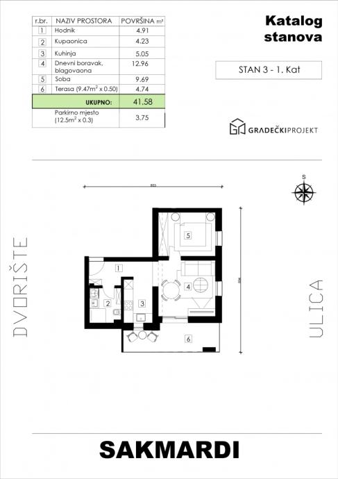 Dvosobni stan na 1. katu koji se sastoji od hodnika, dnevnog boravka s blagovaonicom, kuhinje, jedne spavaće sobe, kupaonice i natkrivene terase, ukupne neto korisne površine 41,58 m2, cijena 103.950,00 €
