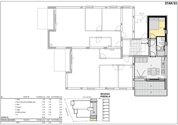 Apartman S3 veličine 41,76 m2 nalazi se u prizemlju i ima balkon/loggiu te privatni vrt, što omogućava neposredan kontakt s prirodom i dodatnu privatnost.
