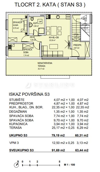 Prodaje se trosoban stan površine 63 m² u novogradnji smješten na drugom katu stambene zgrade s ukupno dva kata bez lifta.