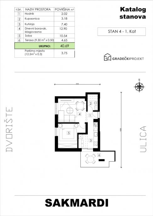 Dvosobni stan na 1. katu koji se sastoji od hodnika, dnevnog boravka s blagovaonicom, kuhinje, jedne spavaće sobe, kupaonice i natkrivene terase, ukupne neto korisne površine 40,69 m2, cijena 101.725,00 €