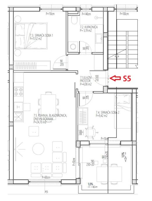 STAN S7 ima 62,33m2 neto korisne površine s uračunatim koeficijentima, te se sastoji od: ulaz, 2 spavaće soba, kupaonica, kuhinja i blagovaonica, dnevni boravak, terasa, te 1 parkirno mjesto. Cijena iznosi 175.000 € (Kupac je oslobođen plaćanja 3% poreza na promet nekretninama).