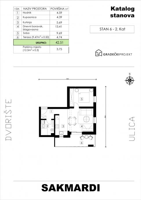 Dvosobni stan na 2. katu koji se sastoji od hodnika, dnevnog boravka s blagovaonicom, kuhinje, jedne spavaće sobe, kupaonice i natkrivene terase, ukupne neto korisne površine 42,51 m2, cijena 106.275,00 €