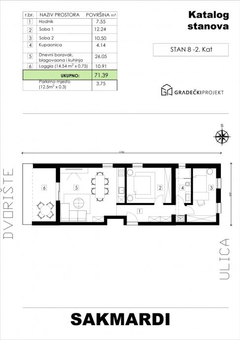 Trosobni stan na 2. katu koji se sastoji od hodnika, dnevnog boravka s blagovaonicom, kuhinje, dvije spavaće sobe, kupaonice i loggie, ukupne neto korisne površine 71,39 m2, cijena 178.475,00 €