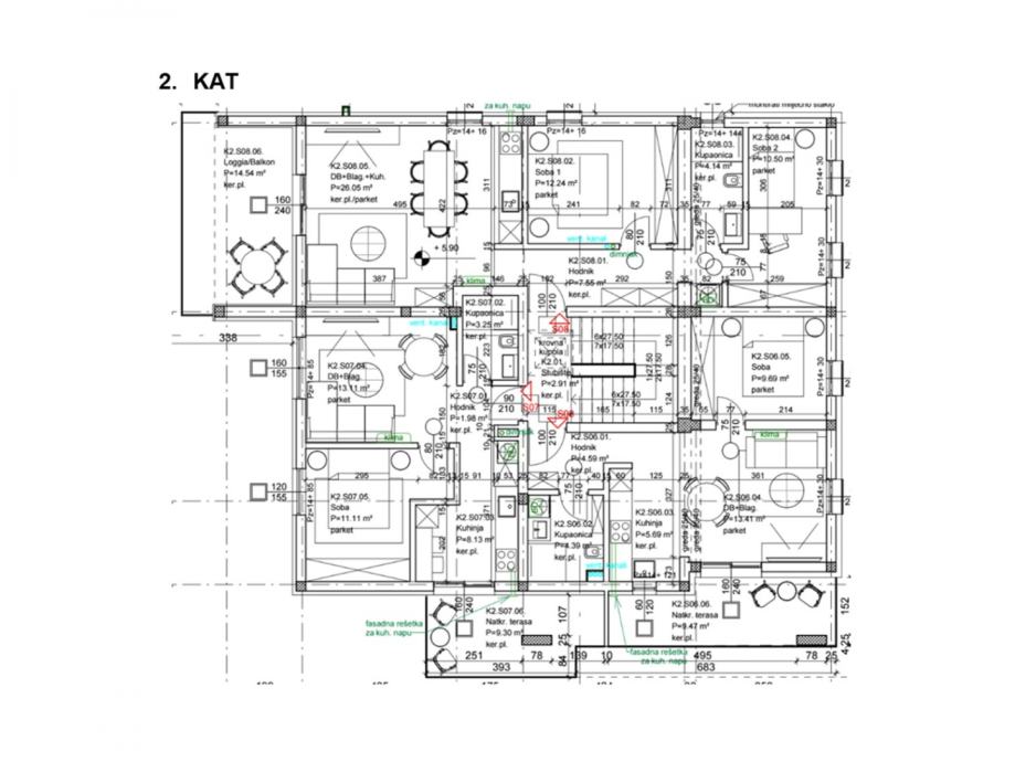 2. kat: dva dvosobna, jedan trosobni stan