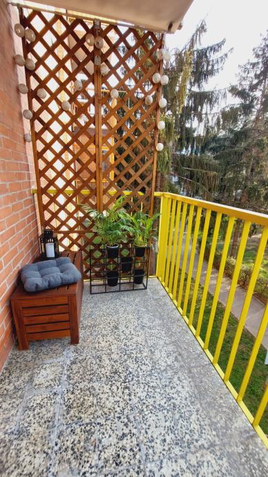 Vanjska stolarija je pvc s izo staklima i vanjskim roletama, čelična protuprovalna ulazna vrata u stan s mdf ispunom, unutarnja vrata drvena s nadsvjetlom. Podovi su iz klasičnih hrastovih parketa, u kupaonici iz porculanskih keramičkih pločica te iz brušenih kulir pločica na balkonu. Stropna led rasvjeta, ptv i grijanje toplovodno radijatorsko na toplanu. Zasebno brojilo za električnu energiju, za vodu zajedničko od zgrade. Prosječna potrošnja u godini na režije iznosi cca 100 € mjesečno.
