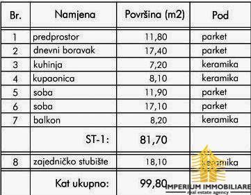 Stan se nalazi na 1. katu i sastoji se od dvije spavaće sobe, dnevnog boravka, kuhinje, predprostora i balkona.