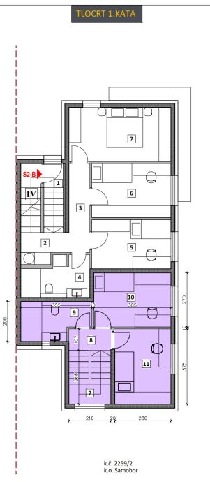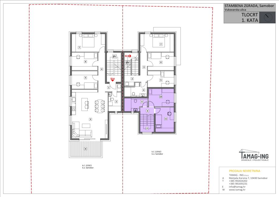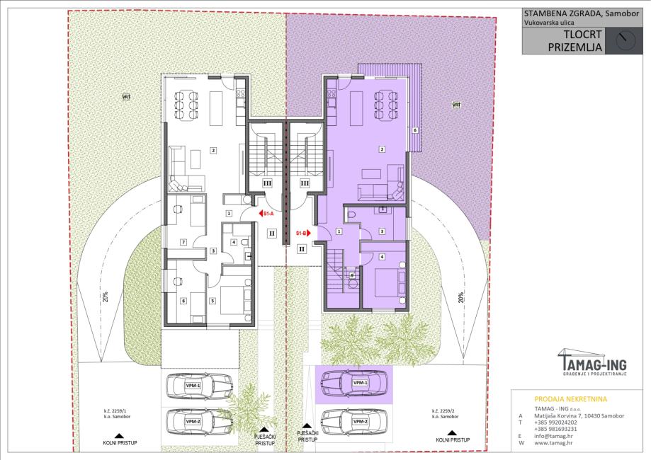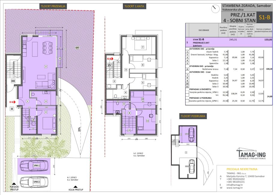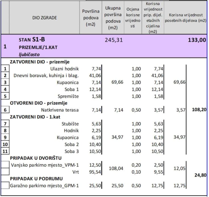 Prodaje se 4-sobni, dvoetažni stan oznake S1-B (prizemlje/1.kat), netto korisne površine stambenog dijela 108.20 m2 zajedno s garažnim parkirnim mjestom u podrumu 25.50 m2 (bruto), vanjskim parkirnim mjestom 12.50 m2 (bruto) i vanjskim vrtom 95.54 m2 (bruto).