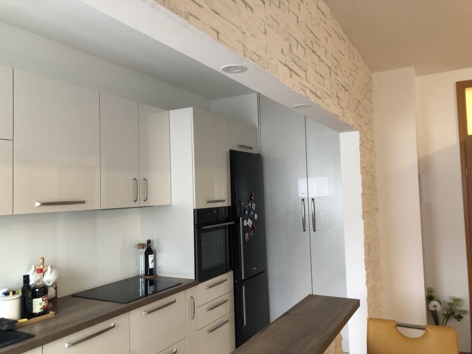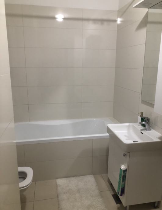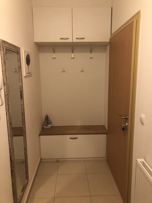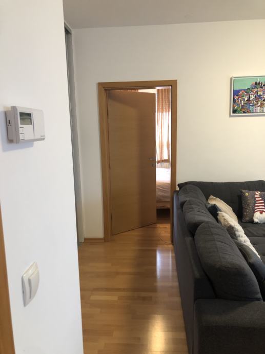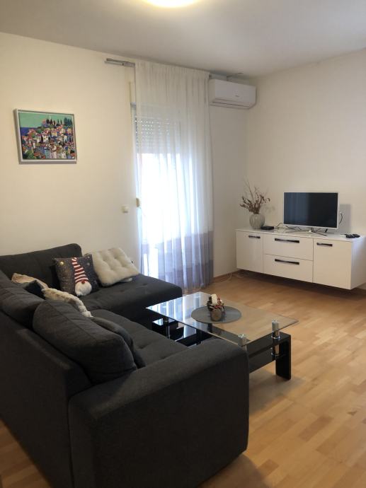 Stan je održavan i opremljen potrebnim namještajem i uređajima: plinsko etažno grijanje, video nadzor zgrade, portafon, perilica rublja, frižider i ledenica, perilica suđa, indukcijska ploča, napa, kauč, televizor, stol i stolice, klima uređaj, ugradbeni ormari, itd.