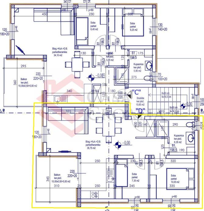 Stan D na katu obračunske površine 67,63 m2 sastoji se od stambenog dijela površine 59,50 m2 (dnevni boravak s kuhinjom i blagovaonicom, dvije spavaće sobe i kupaonica s WC-om), dok ostatak površine otpada na natkrivenu terasu površine 10 m2 (obračunski 5 m2) i vanjsko parkirno mjesto površine 12,50 m2 (obračunski 3,13 m2).