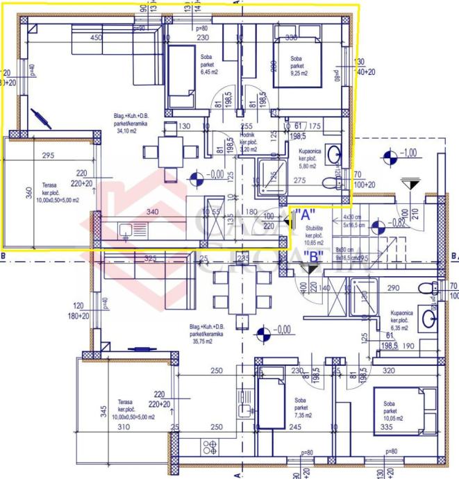 Stan A u prizemlju obračunske površine 69,93 m2 sastoji se od stambenog dijela površine 58,80 m2 (ulazni hodnik, dnevni boravak s kuhinjom i blagovaonicom, dvije spavaće sobe i kupaonica s WC-om), dok ostatak površine otpada na natkrivenu terasu površine 10 m2 (obračunski 5 m2), vrt površine 30 m2 (obračunski 3 m2) i vanjsko parkirno mjesto površine 12,50 m2 (obračunski 3,13 m2).