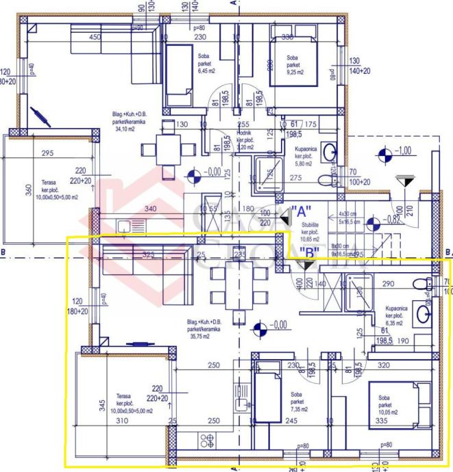 Stan B u prizemlju obračunske površine 80,63 m2 sastoji se od stambenog dijela površine 59,50 m2 (dnevni boravak s kuhinjom i blagovaonicom, dvije spavaće sobe i kupaonica s WC-om), dok ostatak površine otpada na natkrivenu terasu površine 10 m2 (obračunski 5 m2), vrt površine 130 m2 (obračunski 13 m2) i vanjsko parkirno mjesto površine 12,50 m2 (obračunski 3,13 m2).