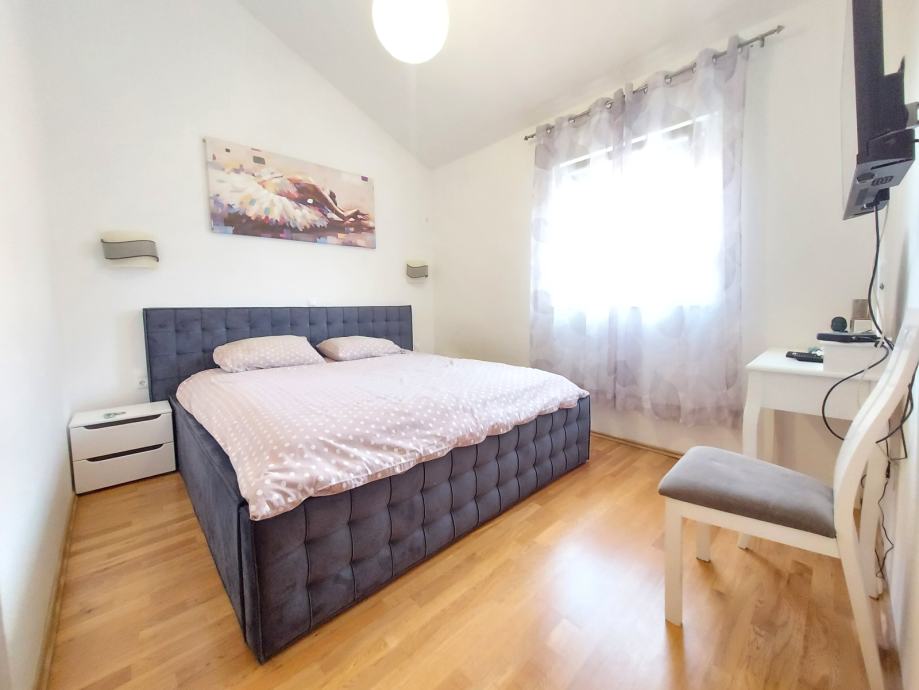 Stan ima 90 m2 te se sastoji od tri sobe, dvije kupaonice, hodnika, kuhinje s blagavaonom, dnevnog boravka i velikog balkona s otvorenim pogledom na more i arhipelag.