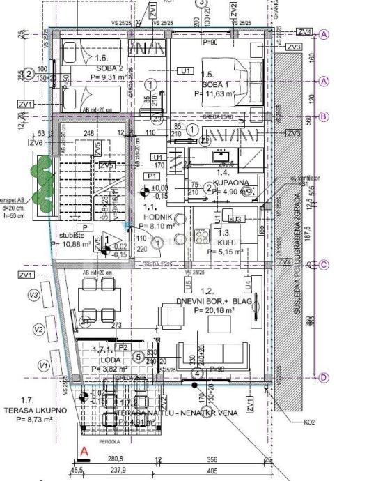 Ovaj stan nalazi se u prizemlju novogradje i sastoji se od ulaznog hodnika, dnevnog boravka s kuhinjom i blagovaonom, 2 spavaće sobe i kupaone. Iz dnevnog boravka se izlazi na prekrasnu, veliku djelomično natkrivenu terasu s privatnim pristupom zajedničkoj okućnici sa zajedničkim bazenom. Samom stanu pripadaju i ograđeni, privatni vrt od 50 m2 te privatno vanjsko parkirno mjesto.