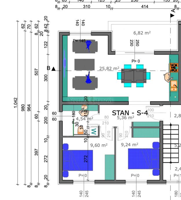 Unutarnji dio stana se sastoji od ulaznog hodnika, velikog dnevnog boravka s kuhinjom i blagovaonom, 2 spavaće sobe i kupaone. Iz dnevnog boravka se izlazi na lijepu natkrivenu terasu od 6,82 m2.
