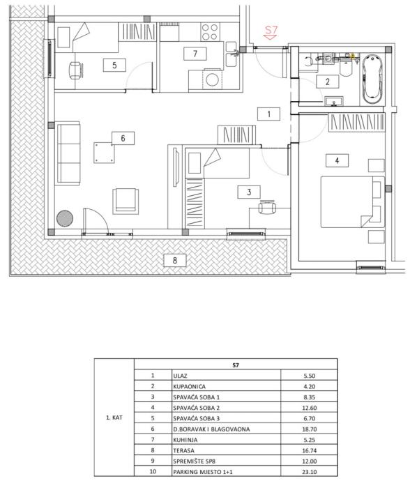 Stanovi su dvosobni, trosobni i četverosobni, a svakom stanu namijenjeno je spremište te parkirno mjesto.