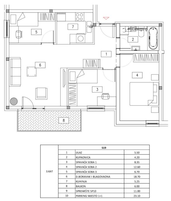 Stanovi su dvosobni, trosobni i četverosobni, a svakom stanu namijenjeno je spremište te parkirno mjesto.